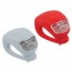 Super-bright, water-resistant LED lights. 3-function (constant, slow and fast flash); 1 white, 1 red. Flexible silicone band for attaching to bikes, bags, helmets etc. Includes 2 x CR-2032 batteries per light.